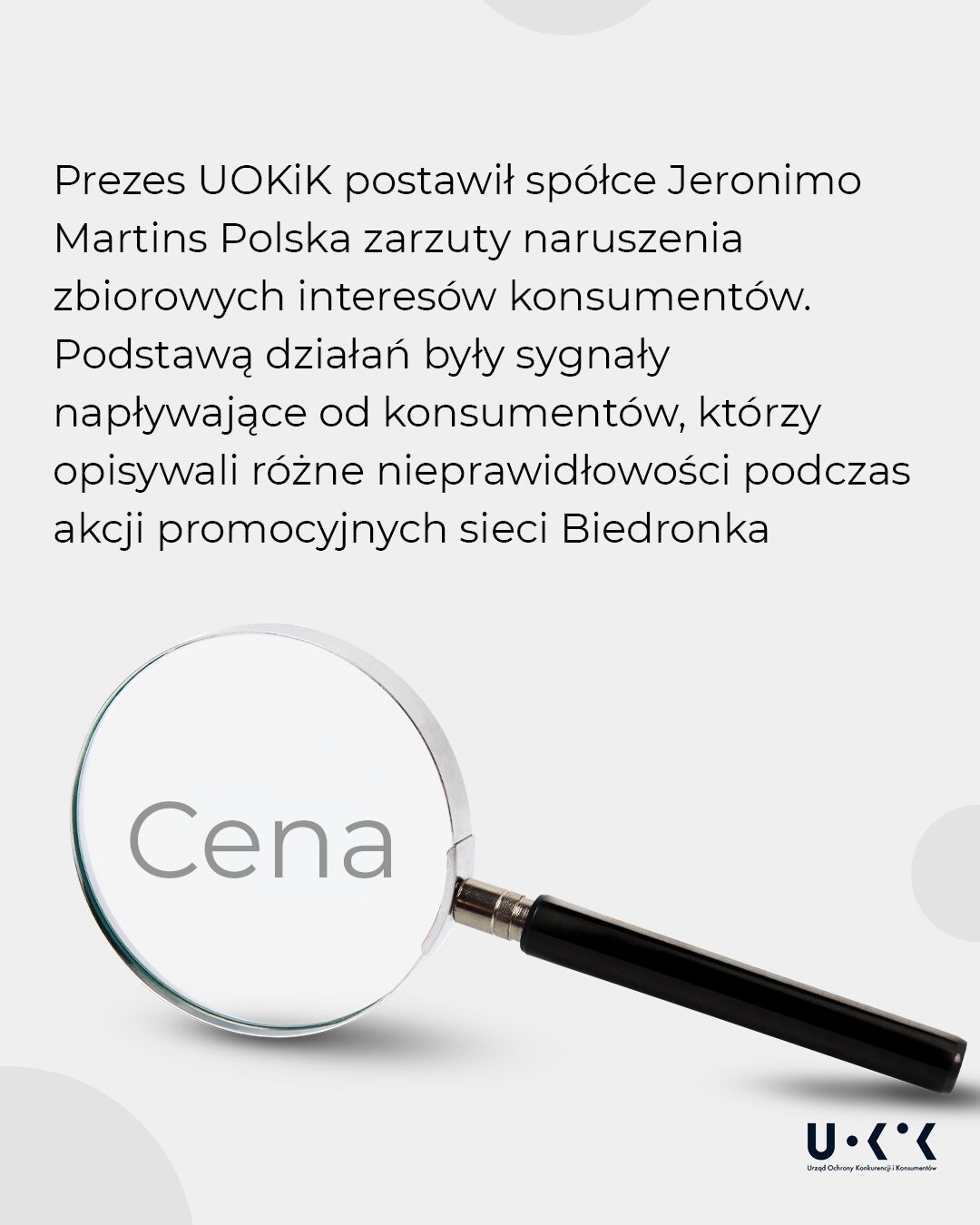 – Podczas zakupów cena jest kluczowym czynnikiem dla konsumentów – część z nich wybiera najtańsze produkty, inni analizują relację ceny do jakości. W obu przypadkach, do podjęcia świadomej i racjonalnej decyzji, konsumentom niezbędna jest jasna informacja o ostatecznej cenie produktu. Natomiast na etykietach cenowych w sklepach Biedronka znajdowały się informacje wprowadzające konsumentów w błąd lub nieczytelne, stąd postawione spółce Jeronimo Martins Polska i jej trzem menedżerom zarzuty łamania podstawowych praw konsumentów dotyczących informowania o cenie. Jest to jasny sygnał również dla innych uczestników rynku, by nie tworzyć niejednoznacznych i skomplikowanych, a tym samym wprowadzających w błąd, obniżek cenowych – wyjaśnia Prezes UOKiK Tomasz Chróstny.