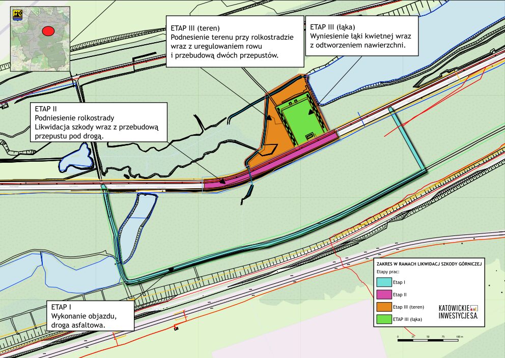 Naprawa szkody górniczej obejmuje rekultywację gruntów, które utraciły swoją wartość użytkową oraz utrzymanie funkcji rekreacyjno-sportowej terenu. W ramach zadania: wybudowana zostanie ścieżka objazdowa o długości ok. 1 km i szerokości 2,5 m na czas realizacji prac, podniesiona zostanie zalewana część drogi rowerowo-rolkowej, podniesiony zostanie teren łąki kwietnej oraz częściowo zrekultywowane zostanie ok. 2 500 m² terenu przyległego od strony południowo-zachodniej do łąki kwietnej. Wartość inwestycji pn. „Przebudowa części terenu Katowickiego Parku Leśnego w ramach usuwania szkody górniczej” wynosi kilka milionów złotych.