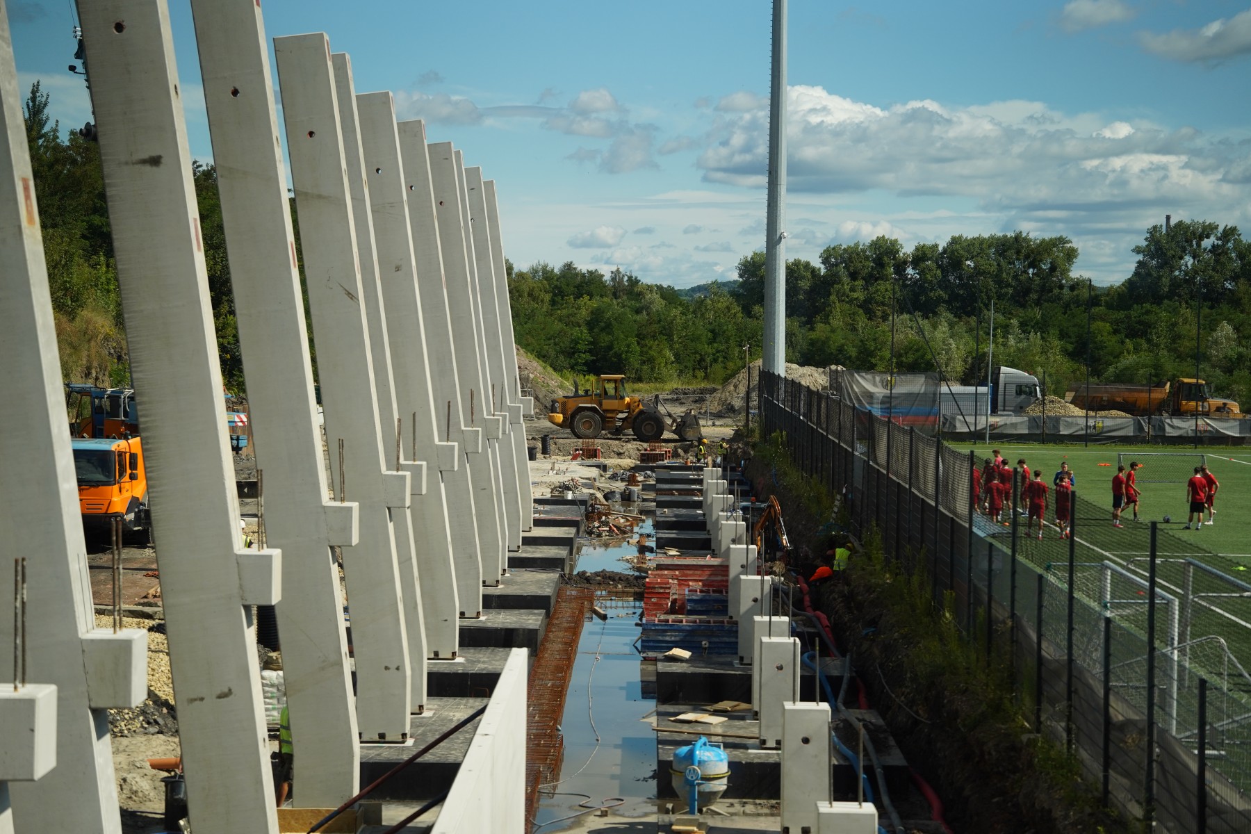 Rozbudowa infrastruktury sportowej przy Piłkarskiej 8 weszła w kluczową fazę. Po wykonaniu 34 fundamentów, wykonawca przystąpił do instalacji głównych elementów konstrukcyjnych trybuny. Zakończenie prac żelbetowych zaplanowano na 8 sierpnia. Równolegle prowadzone są roboty związane z montażem ścianek szczelnych oraz instalacji wodno-kanalizacyjnej.
