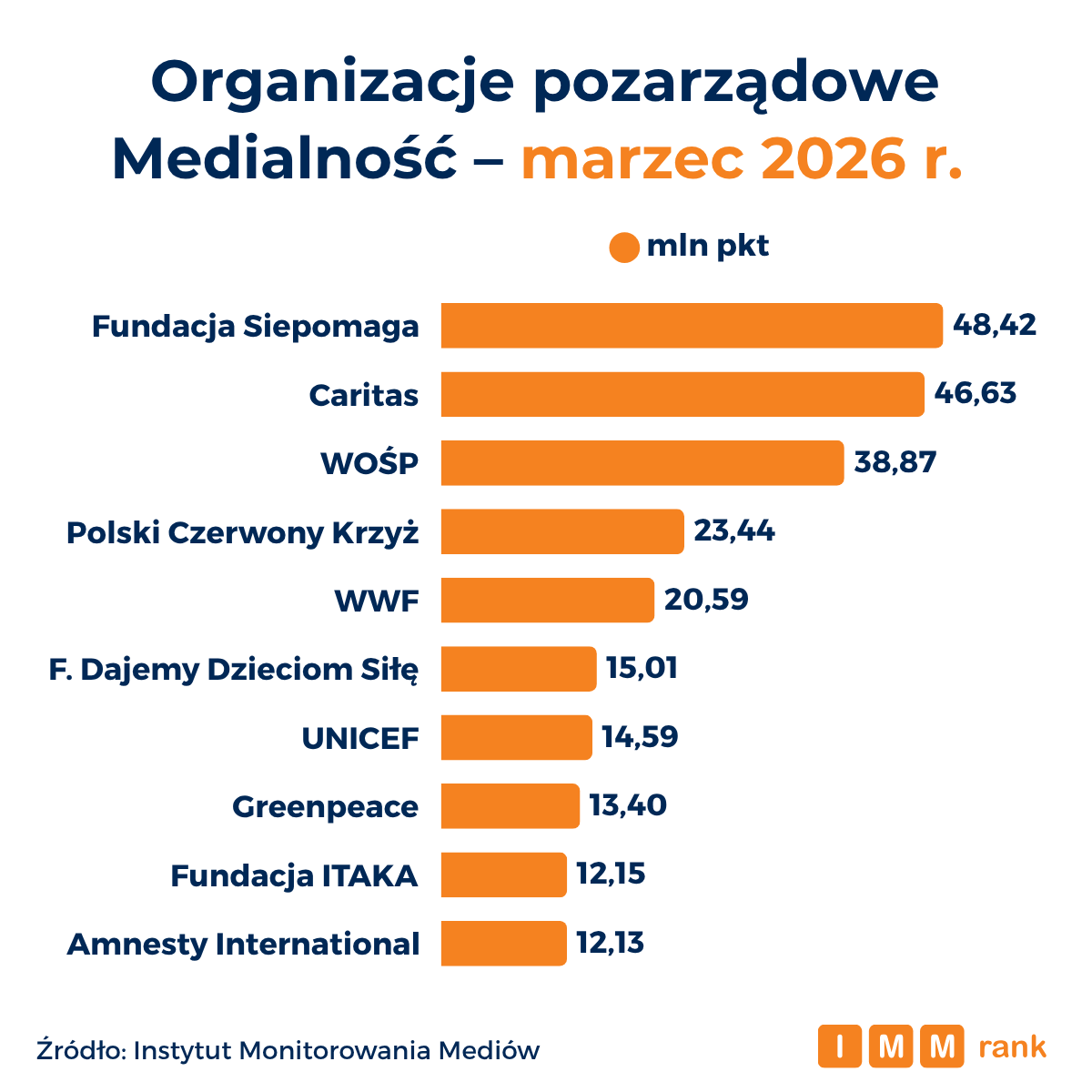 Lider zestawienia – Fundacja Siepomaga – osiągnął w marcu br. 48,42 mln pkt medialności, wyprzedzając Caritas (46,63 mln pkt) o 1,79 mln pkt. Wielka Orkiestra Świątecznej Pomocy zajmuje trzecie miejsce z wynikiem 38,87 mln pkt.