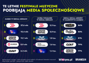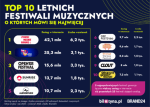 Okres analizy objął pełen rok od rozpoczęcia zeszłorocznych edycji festiwali (maj 2024 r. – kwiecień 2025 r.). Liderem zestawienia okazało się Męskie Granie, z zasięgiem 42 mln odbiorców i 6,2 tys. wzmianek w sieci.