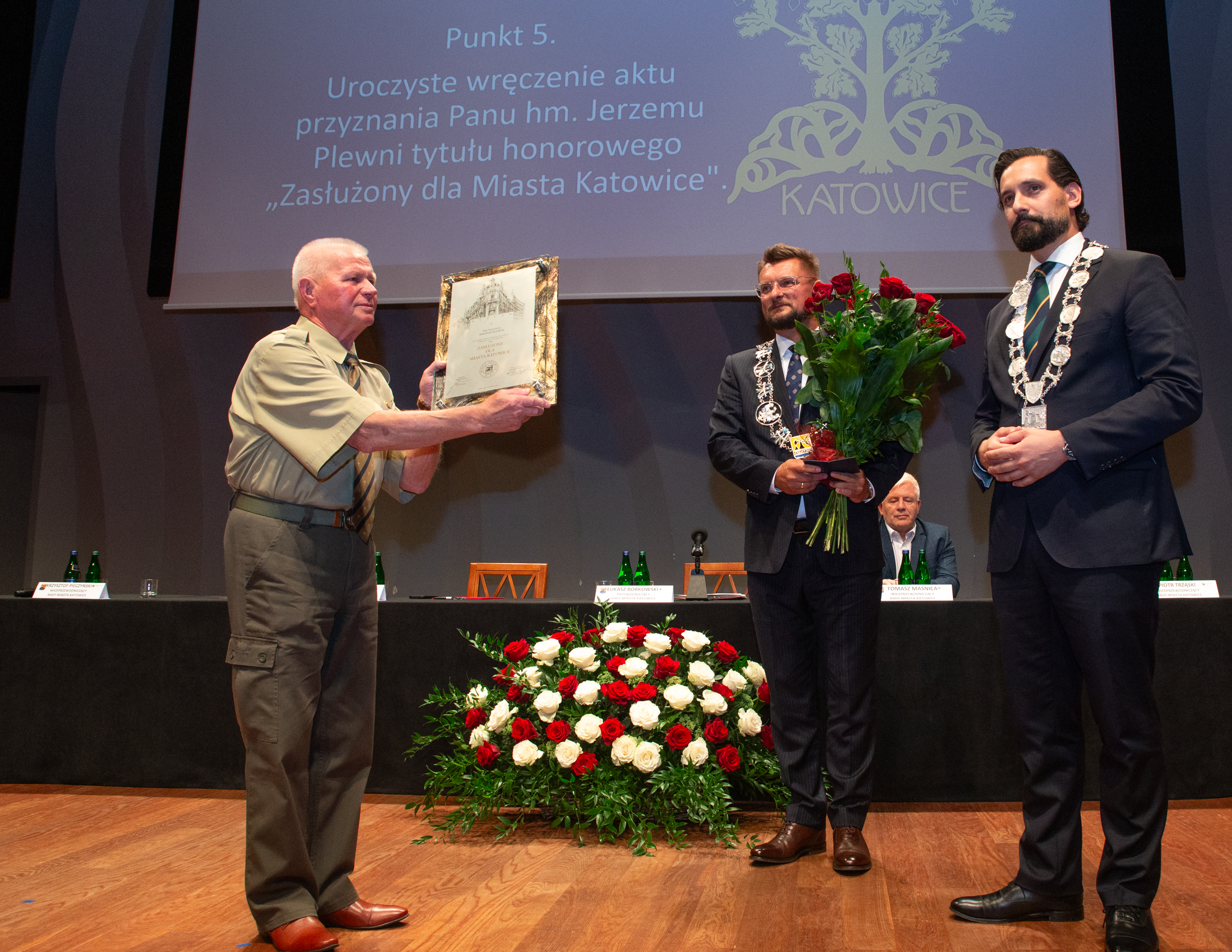 – Dziękuję za to wspaniałe wyróżnienie dla prostego człowieka z Uthemanna. Tytuł Zasłużony dla Miasta Katowice nie byłby możliwy bez wsparcia licznych przyjaciół oraz druhen i druhów z katowickiego hufca. 160 lat Katowic to piękny jubileusz, tym bardziej dla mnie szczególny, że ja sam przeżyłem połowę tego czasu – powiedział podczas przyjmowania tytułu „Zasłużony dla Miasta Katowice” hm. Jerzy Plewnia.